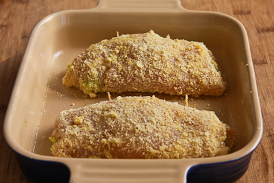 Dip the chicken breasts first in the egg and then in the parmesan-almond flour mixture, patting it on so the chicken breasts are well coated. Place them in a sprayed casserole dish.